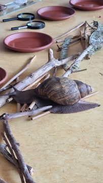 In ruhiger und angenehmer Atmosphäre führte Frau Strauß die Kinder spielerisch an das Thema heran. Die Kinder konnten die Schnecken aus nächster Nähe beobachten, füttern und vorsichtig auf die Hand nehmen. Die langsamen, ruhigen Bewegungen der Tiere halfen den Kindern dabei, selbst zur Ruhe zu finden und ihre Aufmerksamkeit ganz auf den Moment zu richten. Ein besonderes Highlight waren die afrikanischen Riesenschnecken Helmut, Hector und Henriette.
